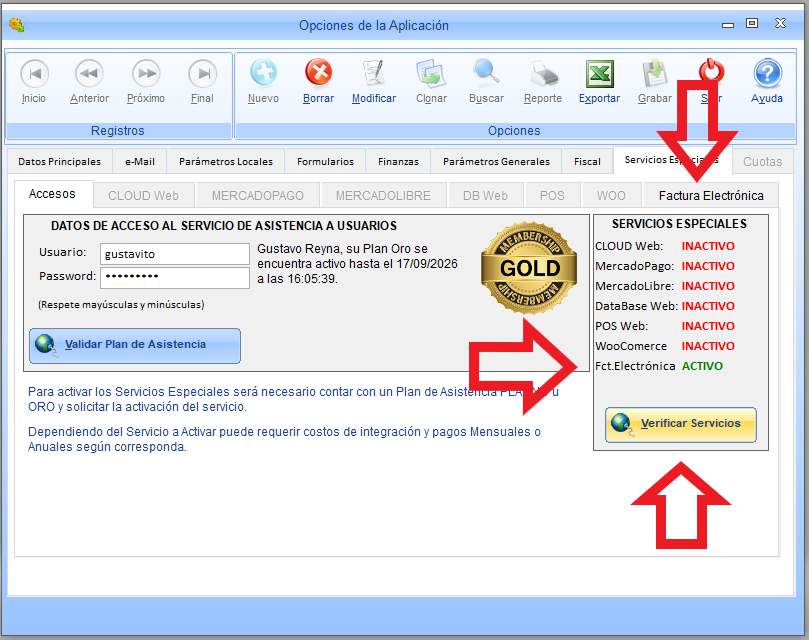 Una vez validado su Plan de Asistencia, se habilitará el botón de VERIFICAR SERVICIOS y se deberá presionar allí para habilitar la pestaña correspondiente. El Servicio Especial de Factura Electrónica se habilitará únicamente en Usuarios de Plan de Asistencia PLATINO y ORO.