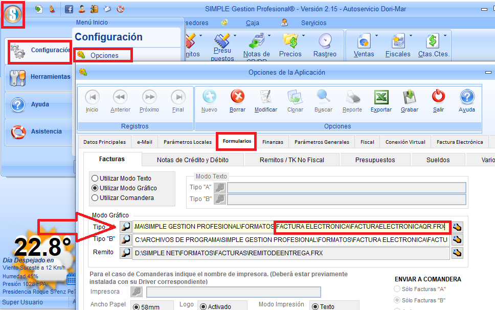 Ahora sólo restará que asigne los formatos de facturas y notas de crédito/débito haciendo click en la opción FORMULARIOS y seleccionando de la carpeta FORMATOS/FACTURA ELECTRÓNICA y FORMATOS/NOTAS DE CREDITO Y DEBITO ELECTRONICA respectivamente.