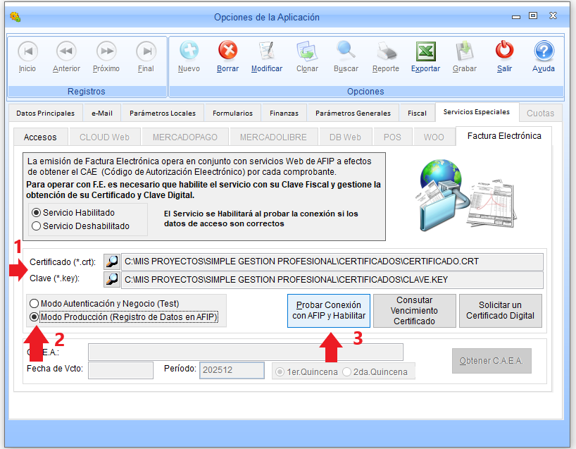 Ingresando a la pestaña FACTURA ELECTRÓNICA será posible indicar la ruta al certificado digital y al archivo llave y asignar la opción MODO PRODUCCIÓN. Una vez esto, deberá presionar sobre el botón PROBAR CONEXIÓN CON ARCA Y ACTIVAR y si todo es estableció correctamente, el indicador superior quedará como SERVICIO HABILITADO.
